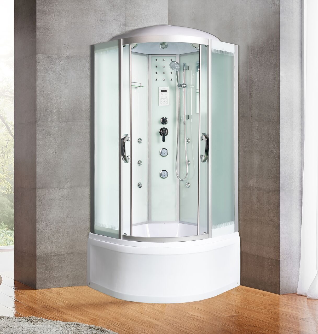 Оснащение bluetooth / Вентиляция / Встроенное сиденье / Гидромассажные форсунки / Душевой гарнитур / Зеркало / Передний съемный экран / Переключатель режимов / Полочка / Радио / Сенсорный пульт управления / Сифон / Смеситель / Тропический (верхний) душ