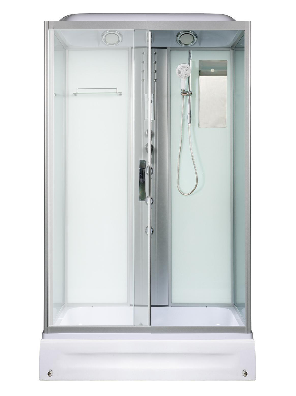 Оснащение Вентиляция / Гидромассажные форсунки / Душевой гарнитур / Передний съемный экран / Переключатель режимов / Полочка / Радио / Сенсорный пульт управления / Сифон / Смеситель / Тропический (верхний) душ