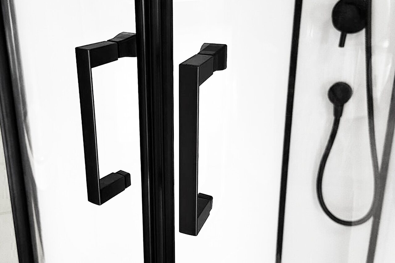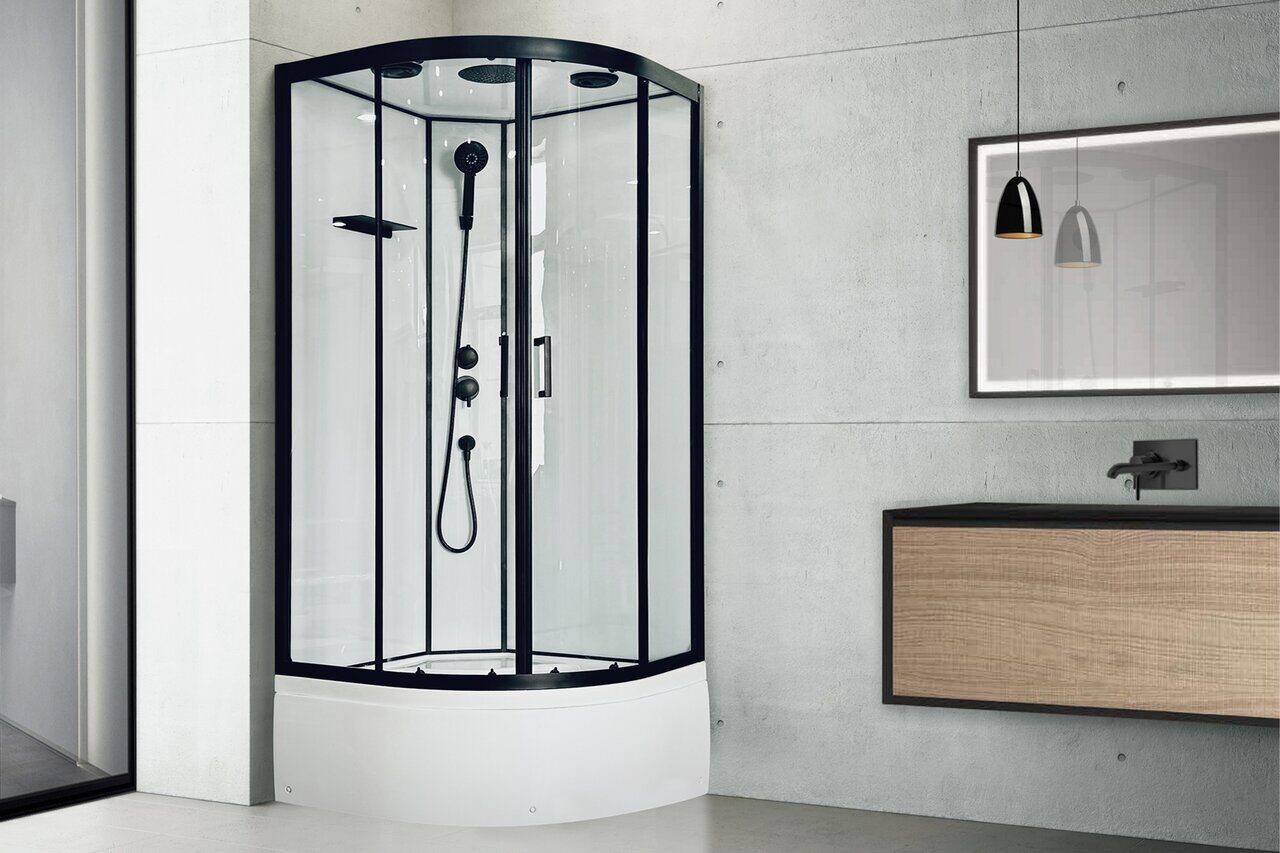 Стильная душевая кабина Royal Bath FATO RB 100CK-T-BL прозрачное стекло сочетает в себе высокую функциональность, практичность и надежность. Для изготовления применяют безопасное закаленное стекло толщиной 5 мм, надежно фиксируемое алюминиевым профилем. Цвет профиля черный. В комплекте: встроенное сиденье, душевой гарнитур, полочка, смеситель, тропический (верхний) душ.