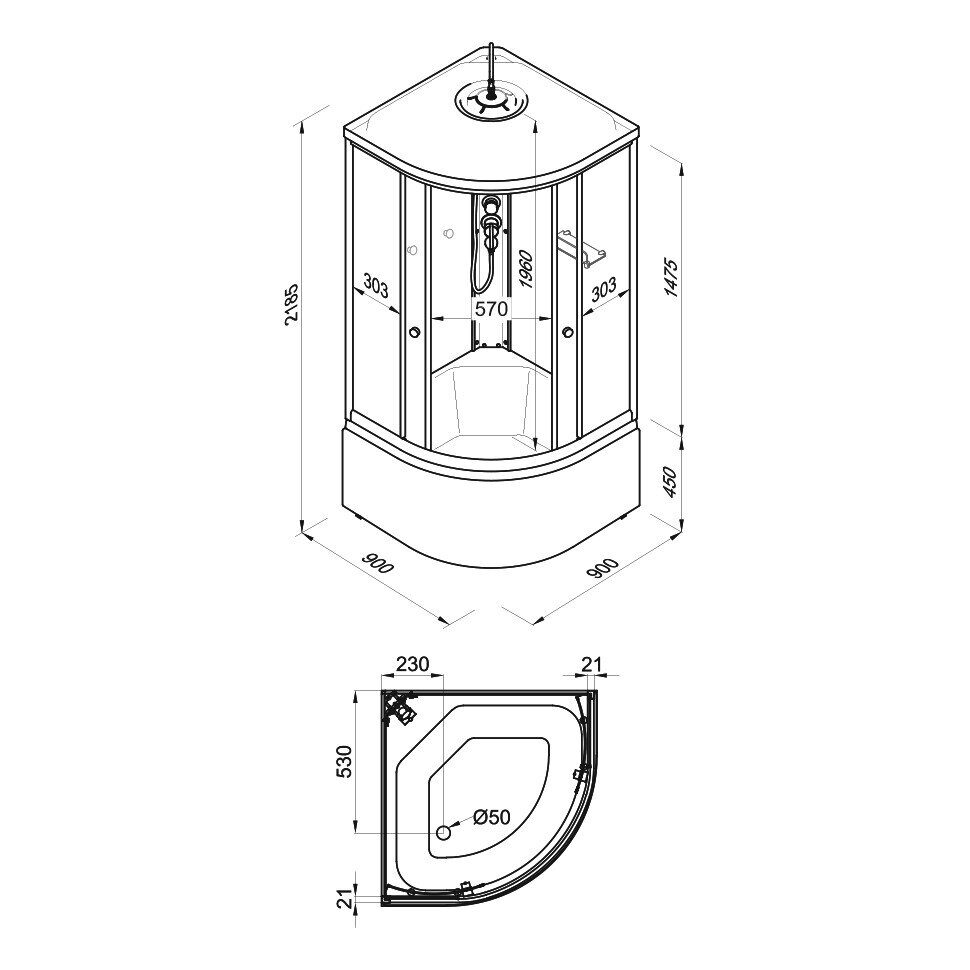 - Размеры, см (ш/г/в): 90х90х216.